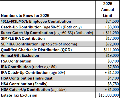 Now is a great time to review your financial plan and make adjustments where needed. Higher contribution limits create opportunities to save more for retirement and healthcare, while new charitable giving rules may require a shift in strategy to maximize deductions. Whether you’re focused on tax efficiency, estate planning, or simply staying ahead of inflation, understanding these changes will help you start 2026 on the right foot. Wondering whether these updates should change your financial strategy? Contact us today.